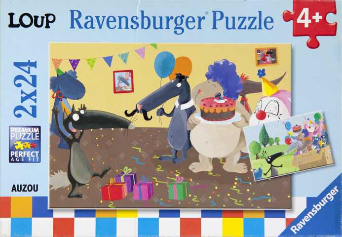 Un puzzle de 126 pièces Disney représentant Mooglie, Baboo et les animaux du livre de la jungle dansant.