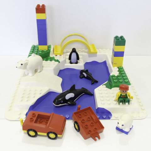 Un grand jeu de Marindland avec une grande piscine et des briques de couleurs pour monter des murs ainsi que quelques ustensiles : 2 ponts, caméra, des fleurs et feuillage, voiture, personnages, otari...