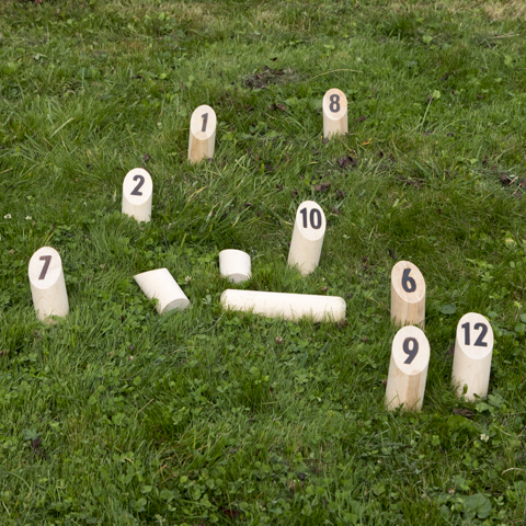 Jeu d'extérieur. Jeu de quilles scandinave qui se joue avec un bâton à lancer sur les quilles numérotées. Le but du jeu est de faire tomber une ou plusieurs quilles pour comptabiliser exactement ...