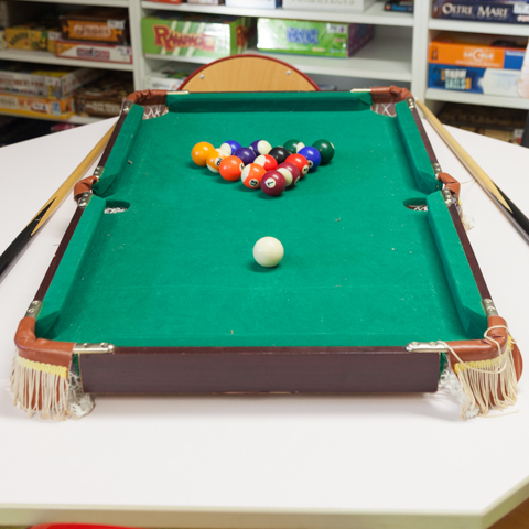 Jeu de billard de petite taille qui se joue avec 16 boules : 15 boules de couleurs et une boule noire. Le but du jeu est de marquer le plus de points en envoyant les boules de couleurs dans les poches...