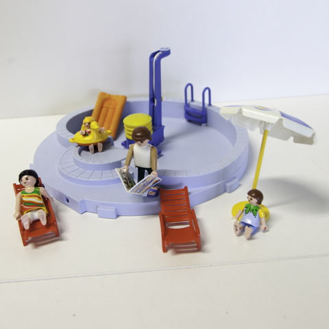 Un jeu de Playmobil avec une piscine et tous les accessoires autour (parasol, glacière, douche, plantes, transat, matelas...).