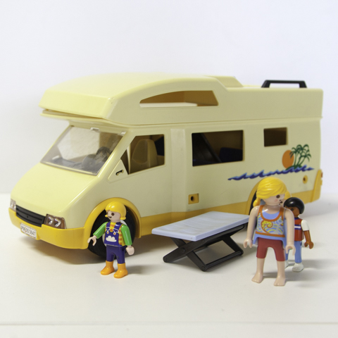 Un camping car Playmobil avec 2 vélos, 1 table et 4 chaises, 1 barbecue, de la vaisselle et des aliments, ainsi que 2 enfants et leurs parents.