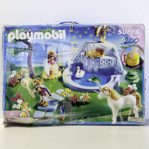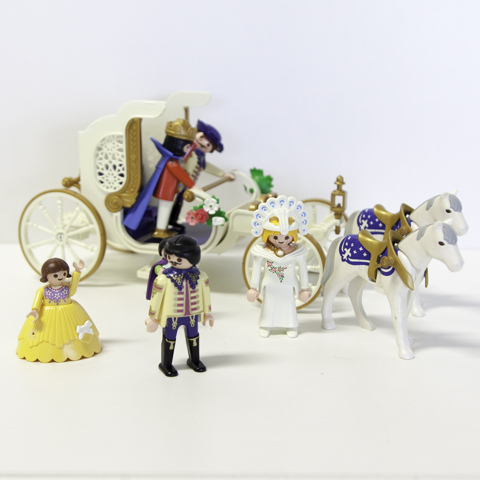 Un château de princesse Playmobil avec de nombreux personnages (princes, princesses, roi, reine, personnel...), une calèche et des chevaux, de nombreux objets de la cour royale, du mobilier...