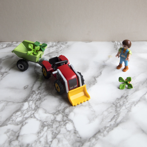 Un agriculteur Playmobil avec un tracteur et remorque et des carottes.