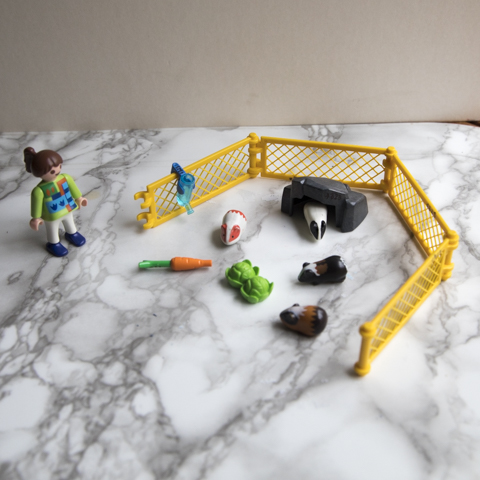Une fillette Playmobil devant un parc avec 5 cochons d'Inde contenant aussi un abreuvoir, un abri, des choux et carottes.