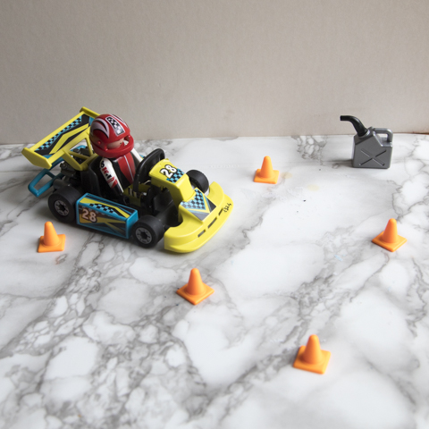 Un pilote Playmobil avec son karting, son bidon d'essence et des plots pour faire un parcours.