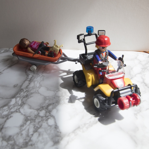 Un secouriste Playmobil sur son quad équipé d'un casque, un GPS, un talkie-walkie ainsi qu'une patiente sur un brancard avec un sac à dos.