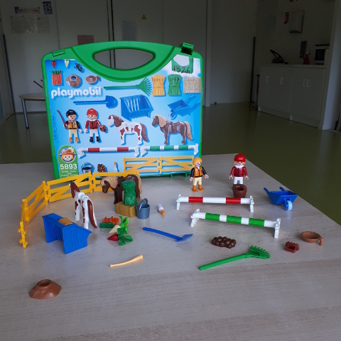 Un parcours équestre Playmobil en extérieur avec des barrières, obstacles, nombreux objets et légumes, 2 cavaliers et deux poneys.