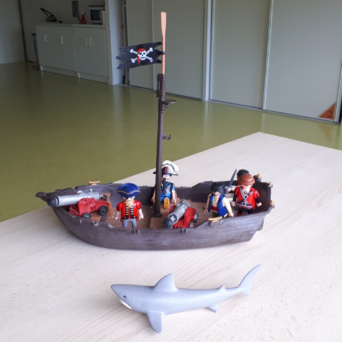 Un bateau playmobil avec 5 pirates équipés ainsi que 2 canons avec leurs projectiles. Un requin tourne autour du bâteau.