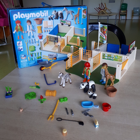 Des animaux Playmobil en cages sont présents dans ce zoo et sa clinique et ses 2 gardiens : une girafe, un zèbre, un panda et son bébé ainsi que tout le matériel pour s'occuper d'eux.