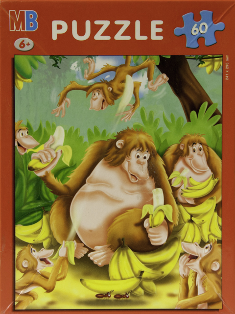 Un puzzle de 60 pièces représentant un singe et sa banane.