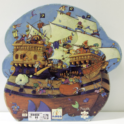Un support en bois représentant un bateau dans lequel il faut encastrer 16 pièces.