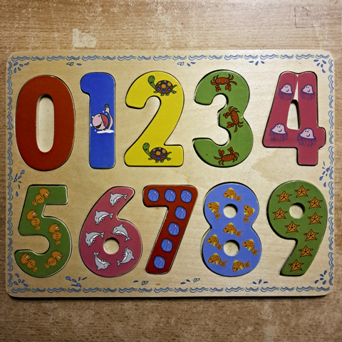 1 planche en bois dans laquelle s'encastre 10 chiffres en bois.