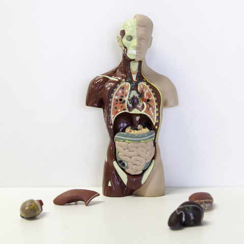 Un jeu éducatif : un torse humain avec tous ses organes et un livret qui explique le fonctionnement des différents organes.