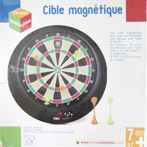 Une cible avec des fléchettes électromagnétiques. Le but du jeu est d'envoyer les fléchettes magnétiques qui se collent sur la cible pour atteindre le score déterminé. Le nombre de points et déco...