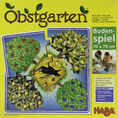Les enfants jouent à tour de rôle contre le corbeau. En lançant le dé, chacun récolte les fruits : pommes, poires, prunes, cerises. Mais attention en tirant une pièce de puzzle, le corbeau grandit. Et...