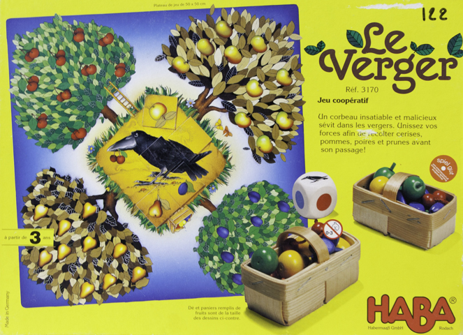 Un jeu grand format : les enfants jouent à tour de rôle contre le corbeau. En lançant le dé, chacun récolte les fruits : pommes, poires, prunes, cerises. Mais attention en tirant une pièce de puzz...