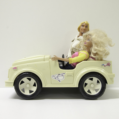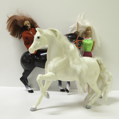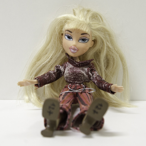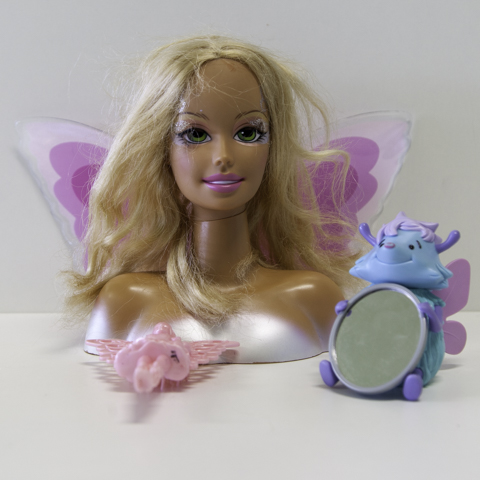 Une tête de barbie à coiffer avec une brosse à cheveux, un miroir, une barrette et paire d'ailes de papillon.