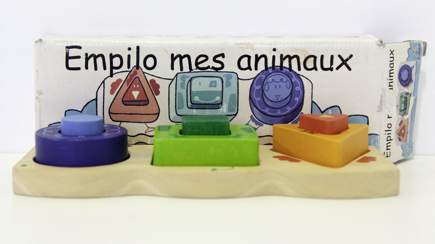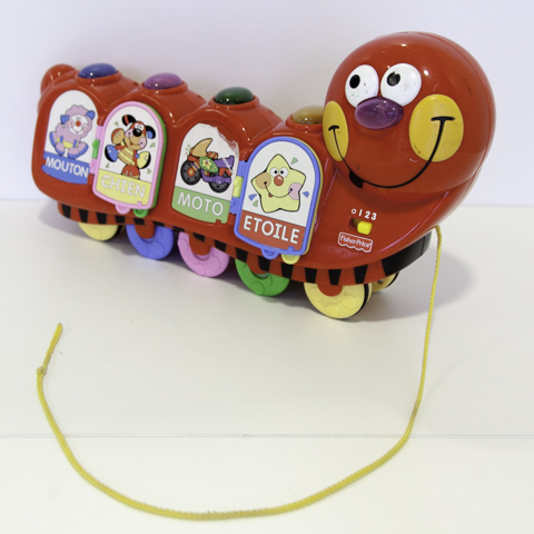 Une chenille à roulette avec son cordon pour la tirer. Elle parle en se déplaçant.